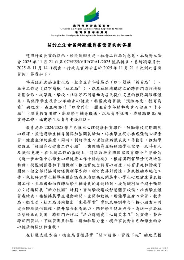 澳區政府教育及青年發展局關於立法會呂綺穎議員書面質詢的答覆如下: