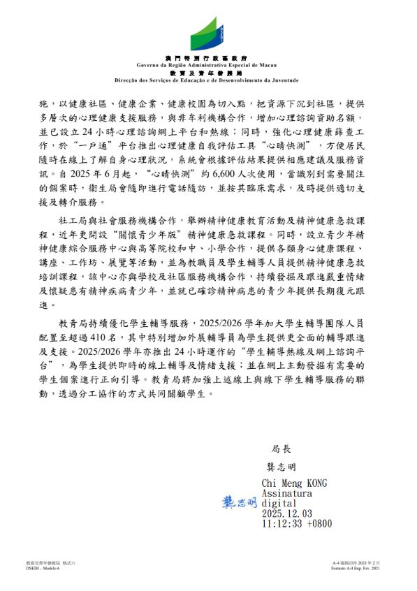 二、心理支援不應僅停留在”兜底”層面,更應發揮”防未病”的作用。隨著人工智能等智慧化技術日益成熟,請問當局會否考慮引入相關工具,定期開展面向全澳青少年的心理健康篩查,建立常態化、數據化的心理監測預警機制,建立早期識別和介入的支援網?
