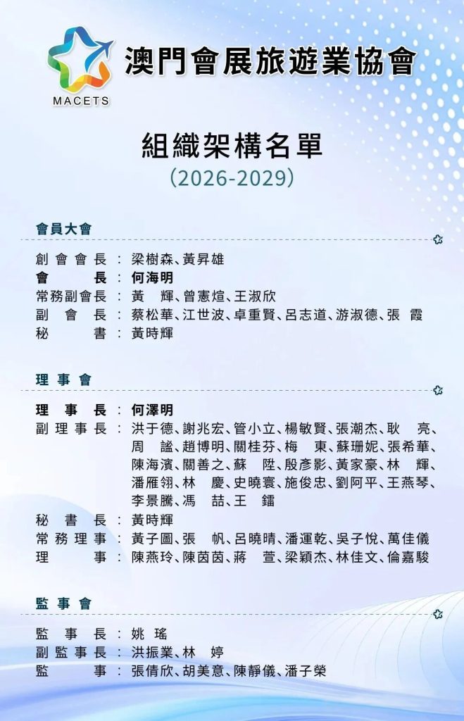 【環球新聞報訊】澳門會展旅遊業協會於12月30日中午12時30分召開「2025年全體會員大會」,順利總結年度會務成果,規劃未來發展藍圖,並選舉產生2026-2029年新一屆組織架構成員:創會會長梁樹森、黃昇雄;會長何海明;常務副會長黃輝、曾憲煊、王淑欣;副會長蔡松華、江世波、卓重賢、呂志道、游淑德、張霞;理事長何澤明;監事長姚瑤;副理事長:洪于德、謝兆宏、管小立、楊敏賢、張潮杰、耿 亮、周 謐、趙博明、關桂芬、梅 東、蘇珊妮、張希華、陳海濱、關善之、蘇 陞、殷彥影、黃家豪、林 輝、潘雁翎、林 慶、史曉寰、施俊忠、劉阿平、王燕琴、李景騰、馮 喆、王 鐳;副監事長:洪振業、林 婷。