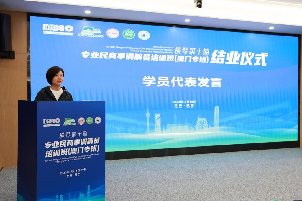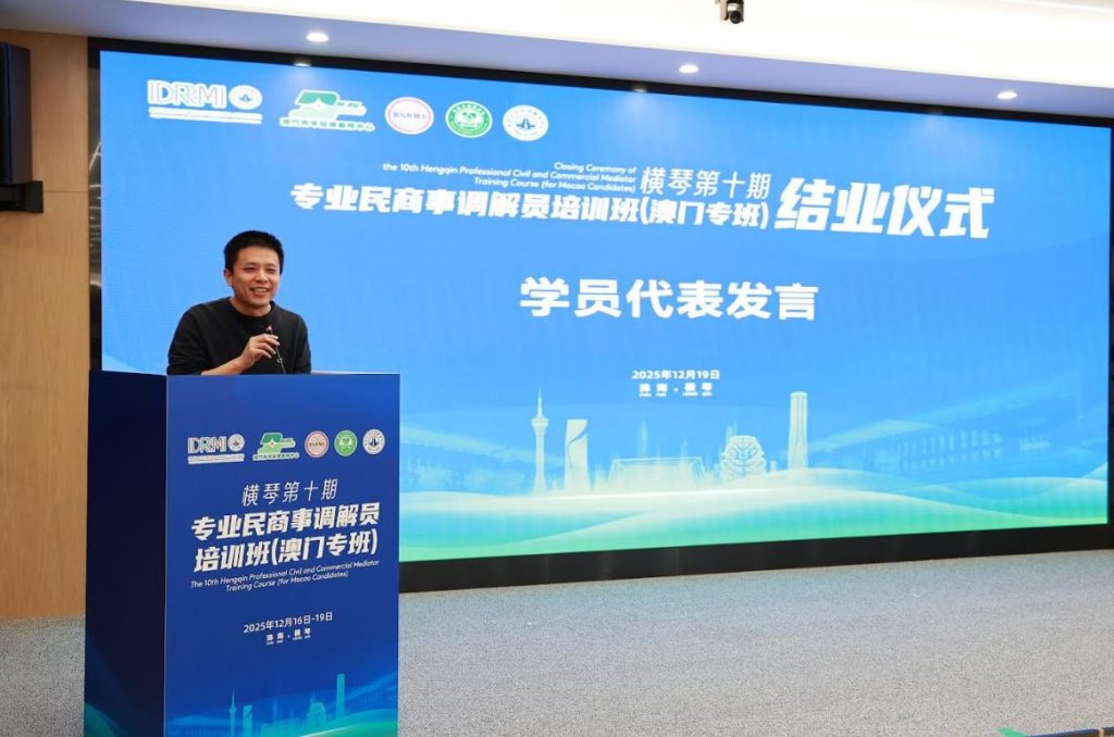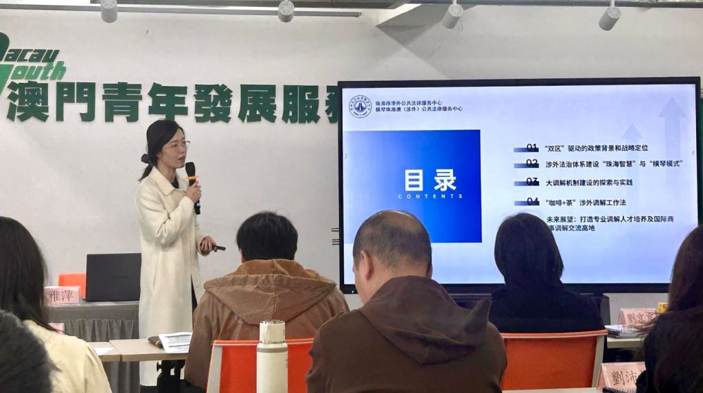 課程由珠海市涉外公共法律服務中心、橫琴珠港澳(涉外)公共法律服務中心,以及澳門青年發展服務中心合辦,由香港國際爭議解決及專業談判研究院認可的資深調解員團隊授課,是粵港澳大灣區專業認證項目。參與的教職員透過線上線下結合的方式在澳門及橫琴兩地完成共40小時課程,深入學習調解概念、策略、程序及溝通技巧,並進行模擬案例實踐。參與課程的教職員均獲得由香港國際爭議解決及專業談判研究院、澳門青年發展服務中心、珠海市調解協會、橫琴國際爭議解決與風險管理人才培訓基地及澳門一帶一路國際商事調解協會聯合頒發的專業民商事調解員培訓證書。