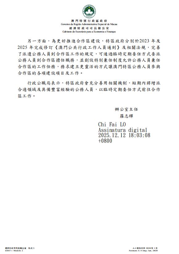 早前,行政法務司司長在立法會回應議員提問時表示“截至2025年10月31日,通過臨時定期委任方式派往合作區執行委員會及所屬機構任職的全職公務人員共30名。此外,合作區面向澳門居民開展兩次員額制招聘,目前澳門員額制人員為84人,佔全部員額制人員的48%。”