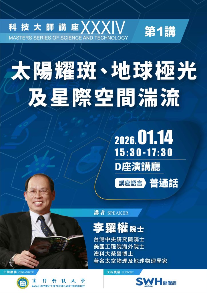 【環球新聞報訊】由澳門科技大學主辦,新偉浩進出口貿易有限公司支持的本學期第一場科技大師講座將於1月14日(週三)下午15:30在大學D座演講廳舉行,台灣中央研究院院士、美國工程院海外院士、澳科大榮譽博士、著名太空物理及地球物理學家李羅權院士主講。