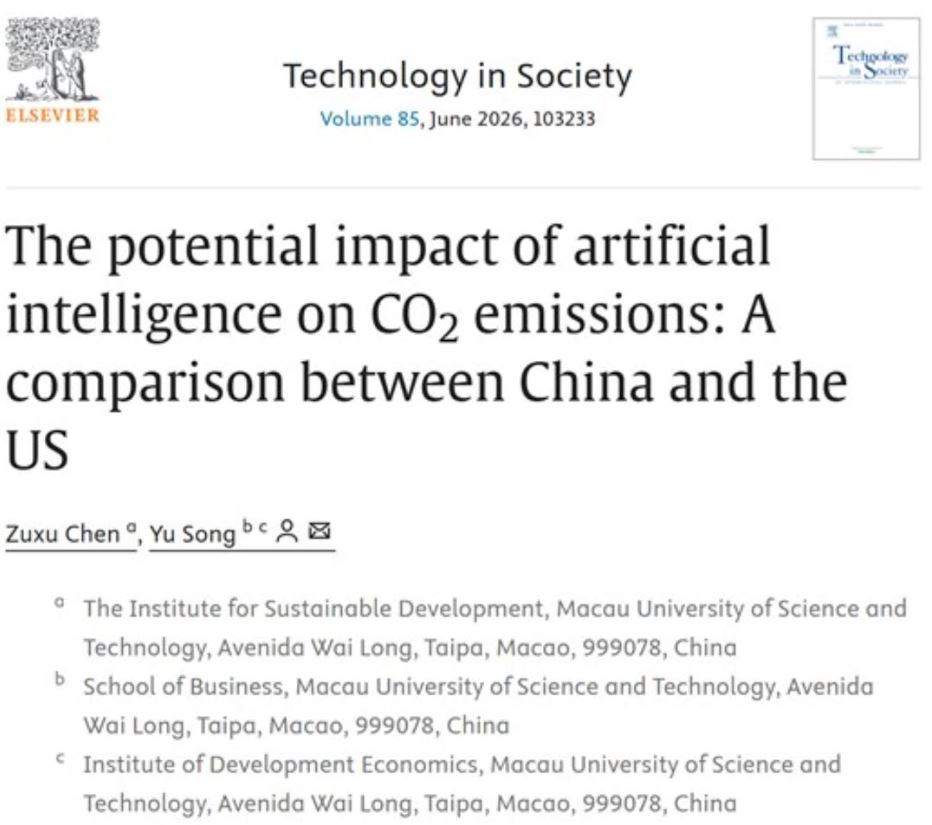 【環球新聞報訊】2026年1月8日,澳門科技大學可持續發展研究所2024級博士研究生陳祖旭於社會學領域權威期刊Technology in Society發表了題為 “The potential impact of artificial intelligence on CO2 emissions: A comparison between China and the US” 的研究論文,對人工智能的應用給中國和美國二氧化碳排放造成的影響展開探討。該論文的通訊作者為其導師、商學院教授、發展經濟學研究所助理所長宋宇教授。