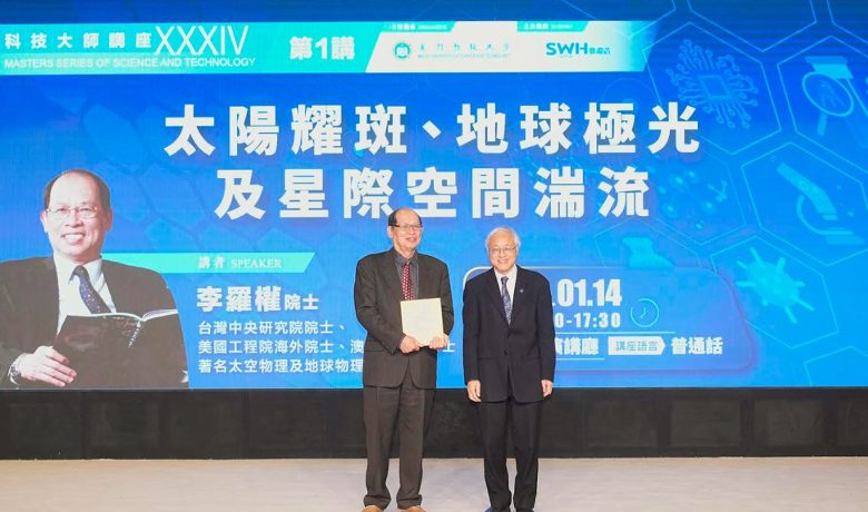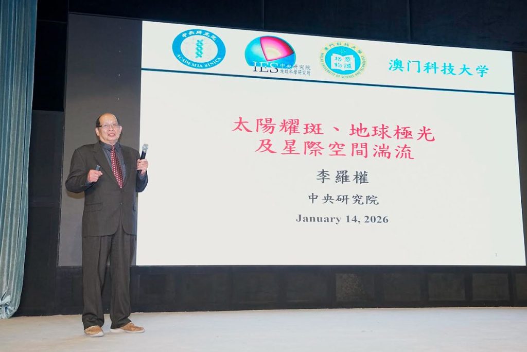 【環球新聞報訊】由澳門科技大學主辦的科技大師講座「太陽耀斑、地球極光及星際空間湍流」,於 2026年1月14日下午在澳科大D座演講廳成功舉辦。本講座邀請到台灣中央研究院院士、美國工程院海外院士、澳科大榮譽博士、著名太空物理及地球物理學家李羅權院士主講。澳科大譚廣亨副校長為本次講座致辭並向李院士致送紀念品,許敖敖榮休校長亦出席現場。