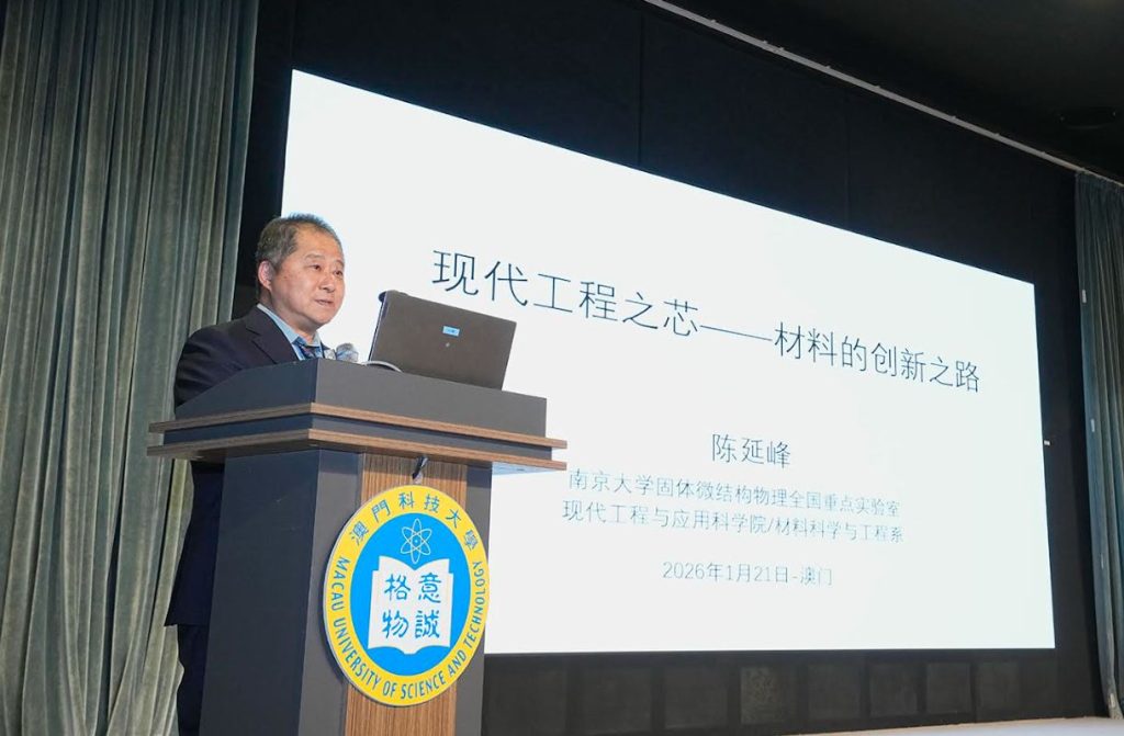 【環球新聞報訊】由澳門科技大學主辦的科技大師講座「現代工程之芯 ── 材料」,於 2026 年 1 月 21 日(星期三)下午在澳科大D座禮堂成功舉辦。本講座邀請到中國科學院院士,材料物理、無機非金屬材料、人工帶隙材料專家陳延峰院士主講。澳科大副校長姜志宏講座教授為本次講座致辭,並向陳院士頒發榮譽聘書及致送紀念品。
