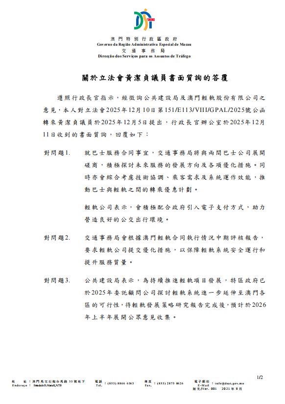 澳區政府交通事務局關於立法會黃潔貞議員書面質詢的答覆如下: