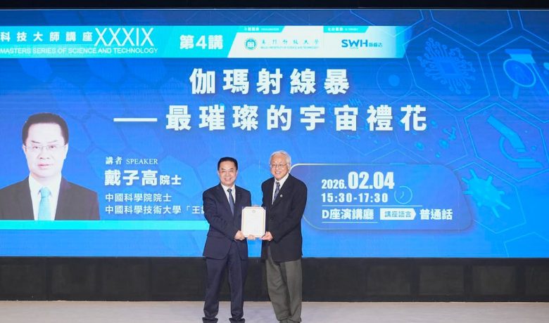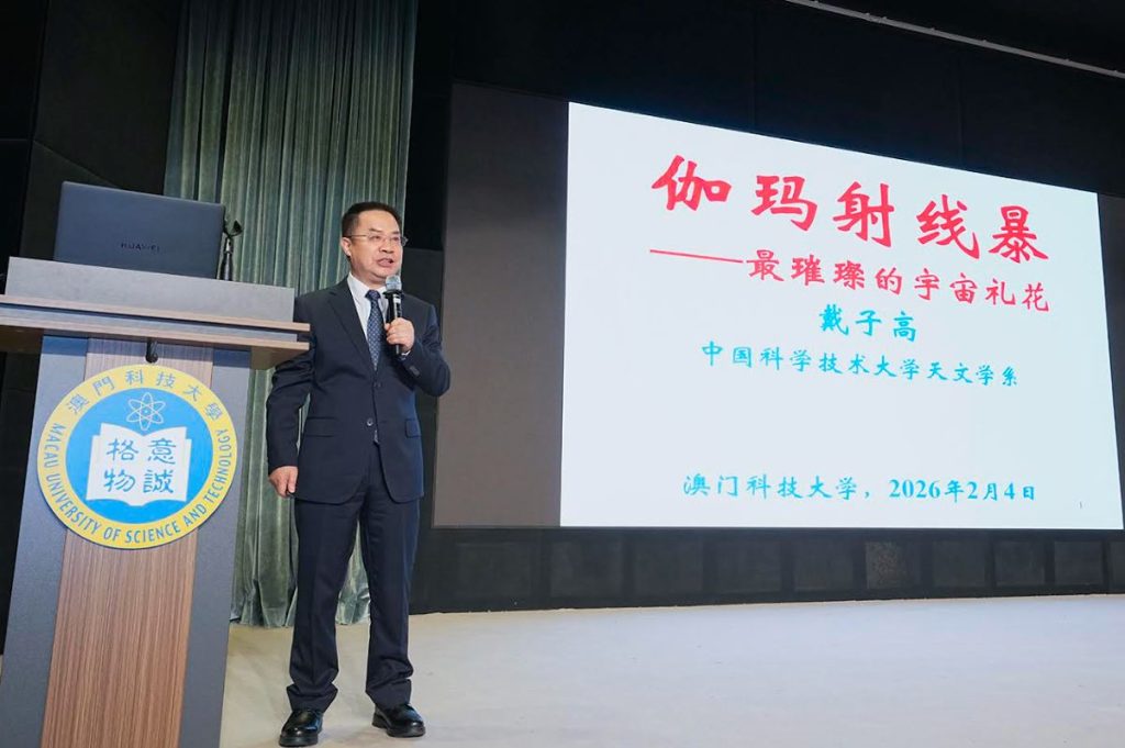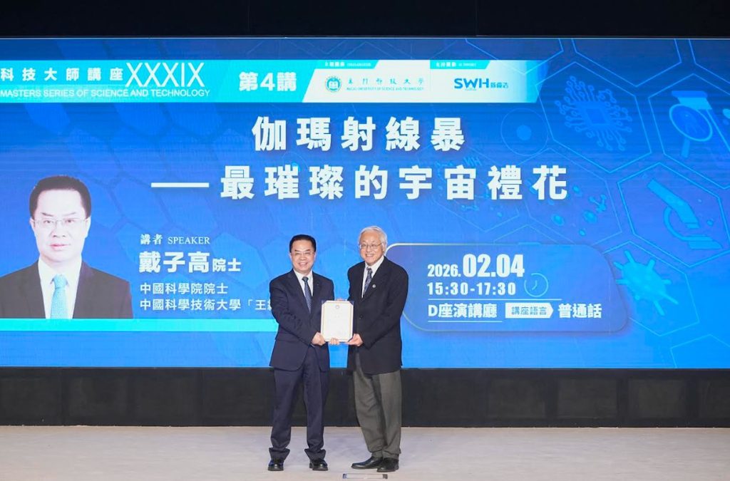 【環球新聞報訊】由澳門科技大學主辦的科技大師講座「伽瑪射線暴 —— 最璀璨的宇宙禮花」,於 2026 年 2 月 4 日(星期三)下午在澳科大 D座演講廳成功舉辦。本講座邀請到中國科學院院士、中國科學技術大學「王綬琯講席」教授戴子高院士主講。澳科大副校長譚廣亨講座教授為本次致辭,並向戴院士頒發榮譽聘書並致送紀念品。