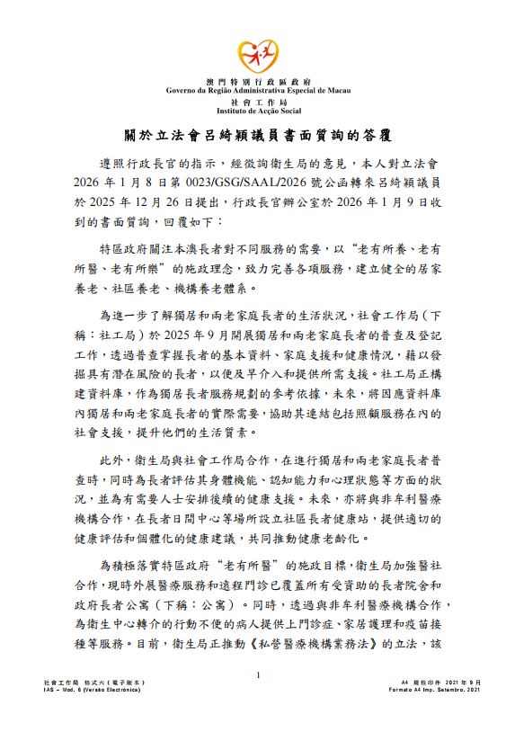 澳區政府社會工作局關於立法會呂綺穎議員書面質詢的答覆如下: