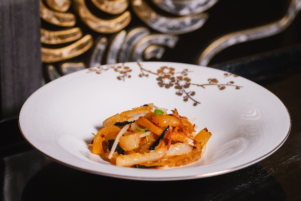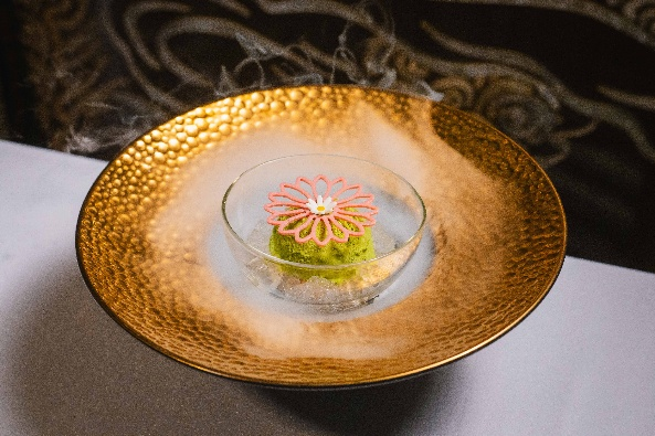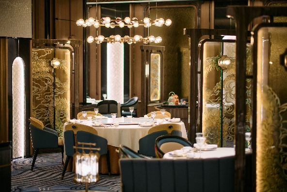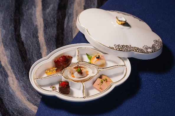 於去年七月經重新裝潢後啟幕的玥龍軒,以東方山海意象為美學主軸,將雲紋、龍形與貝母材質等細節巧妙融入室內設計之中,為這場盛宴提供了絕佳的敘事舞台。晚宴現場不僅為賓客們呈現沉浸式的視覺藝術,更匠心設計貫穿始終的感官體驗:從空靈深邃的手碟環繞聲景,到婉轉動人的二胡與口琴現場表演,再到茶藝師行雲流水的工夫茶儀式,多重藝術體現與珍饈美饌交織,共同構築了一場貫通視覺、聽覺、味覺與哲思的沉浸之旅。