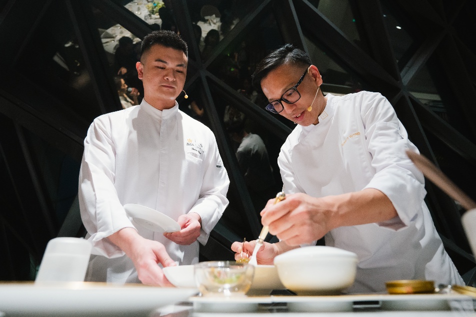 ▲從左至右為:「二十年魚子金吉魚叉燒佐燒椒番茄汁」、「龍井茶燻香茅乳鴿」