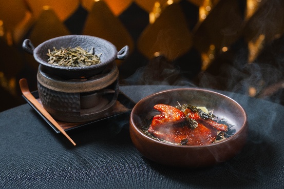 進入第二章節「綻放」,風味漸趨於豐盈明亮。由雙方團隊攜手打造的「二十年魚子金吉魚叉燒佐燒椒番茄汁」,以天頤的粵式叉燒技法演繹當季肥美金吉魚,佐以自熬燒椒番茄汁與二十年陳魚子醬,海陸之鮮在此和鳴,展現了杭幫菜兼容並蓄的現代氣韻。「龍井茶燻香茅乳鴿」為天頤的招牌菜式「香茅妙齡鴿」的限定變奏之作,以短時低溫的龍井輕燻技法,為細嫩乳鴿蒙上一層江南春意,成為貫穿春宴的生動點睛。由解香樓呈獻的「紫蘇羊腩燴粉皮」,以溫補羊腩呼應立春滋養之意,佐以紫蘇清香平衡油脂,在暖意與清新之間勾勒春日滋養之感。