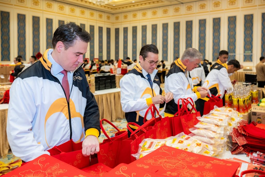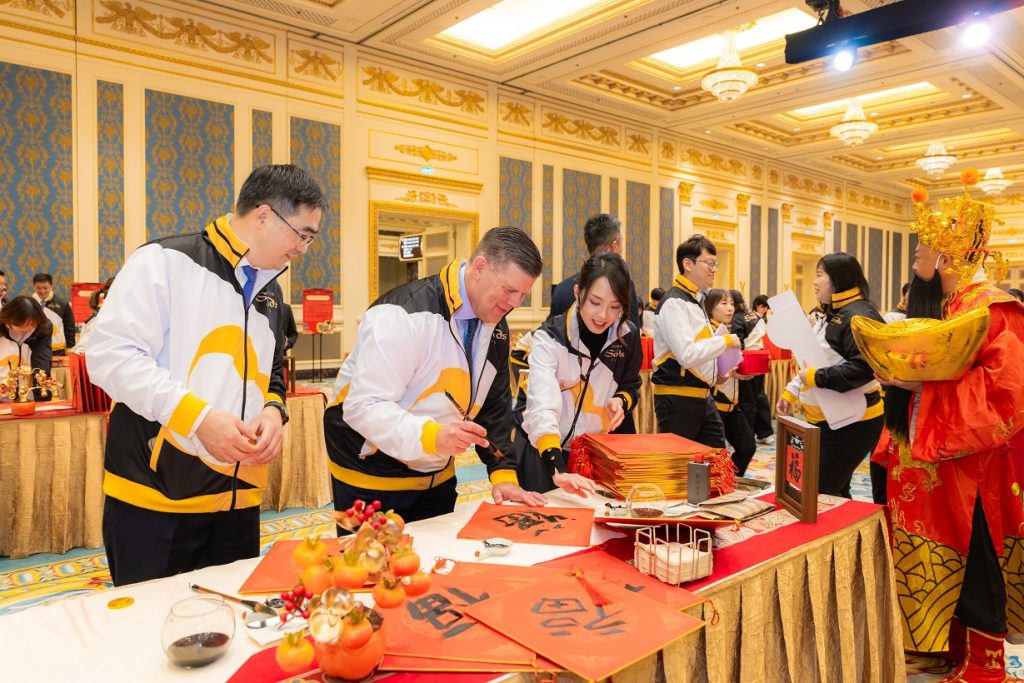 期間,Patrick Dumont及管理層更入鄉隨俗,親身學習書寫迎春納「福」的揮春,感受「福」字背後承載的中國吉祥寓意;更以廣東話及普通話,向團隊成員及公司的義務工作者送上地道祝福,在筆墨流轉與笑聲之間,將新春的喜悅與福氣傳遞至澳門社區,也展現集團對澳門中華根脈文化的尊重與珍視,場面洋溢著溫馨而真摯的節日氣氛。