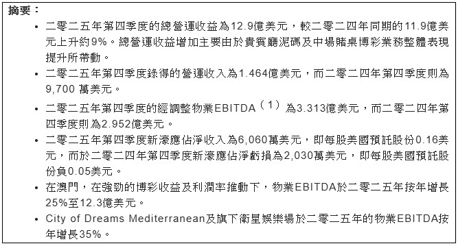 「菲律賓方面,新濠天地(馬尼拉)的業績受競爭壓力及行業不利因素影響。塞浦路斯方面,City of Dreams Mediterranean及旗下衛星娛樂場於二零二五年的物業EBITDA按年增長35%。」