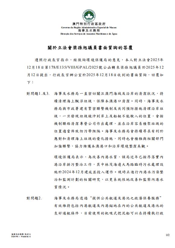 澳區政府海事及水務局關於立法會梁孫旭議員書面質詢的答覆如下: