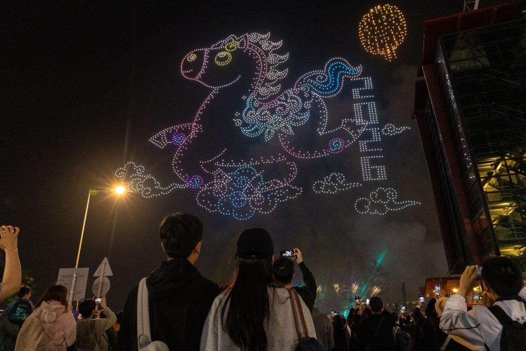 首度推出的「金駿雲翔 歡樂春節」2026無人機煙花匯演同日晚上於旅遊塔對出海面上演,採用3,888架無人機結合煙花、音樂與雷射效果,約15分鐘的演出以生肖馬與新春祝福為主題,融合創新科技與傳統節慶元素,增強演出的層次感與觀賞性,豐富節慶體驗。第二及第三場無人機煙花匯演場次將於年初七(2月23日)及正月十五(3月3日)晚上9時再度上演。
