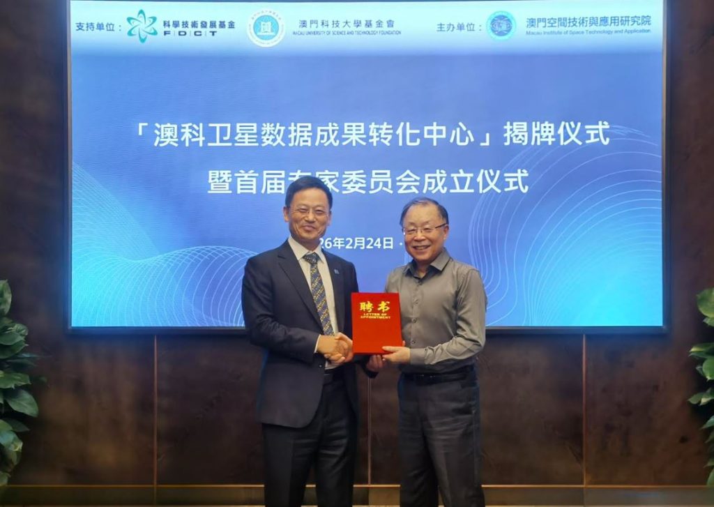 【環球新聞報訊】2024年12月19日上午,習近平主席視察澳門科技大學的「澳科衛星科學與應用數據中心」,聽取了「澳科一號」衛星首席科學家匯報衛星成果、「澳科二號」衛星計劃及組建中國首個高精度地磁衛星星座的方案。主席充分肯定項目成果,並指示盡快搭建地磁應用系統平台,服務國民經濟各行各業。為響應習主席視察的重要指示,在澳門科學技術發展基金的支持下,「澳科衛星數據成果轉化中心」於2026年2月24日在珠海舉行揭牌儀式暨首屆專家委員會成立儀式,由澳門科學技術發展基金行政委員會主席余雨生、澳門科技大學校董會副主席兼秘書長陳季敏、澳門科技大學校長朱健康、專家委員會主任廣州大學教授樊軍輝揭牌,還有來自澳門科學技術發展基金、澳門科技大學基金會、澳門科技大學及多所內地高校的專家學者齊聚一堂,共同見證這一重要時刻。