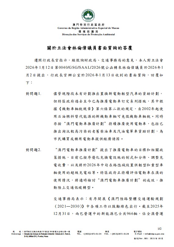 澳區政府環境保護局關於立法會林倫偉議員書面質詢的答覆如下: