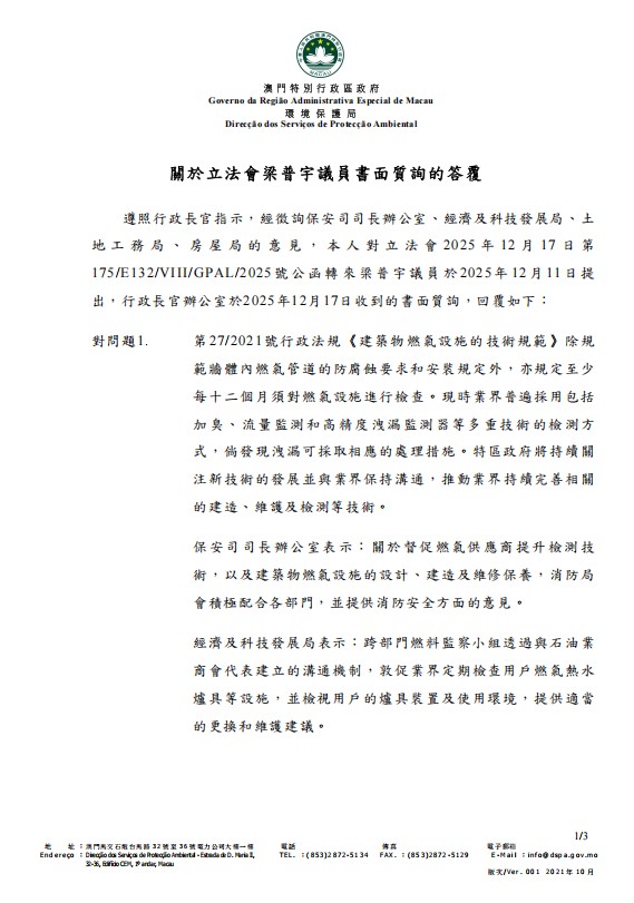 澳區政府環境保護局關於立法會梁普宇議員書面質詢的答覆如下: