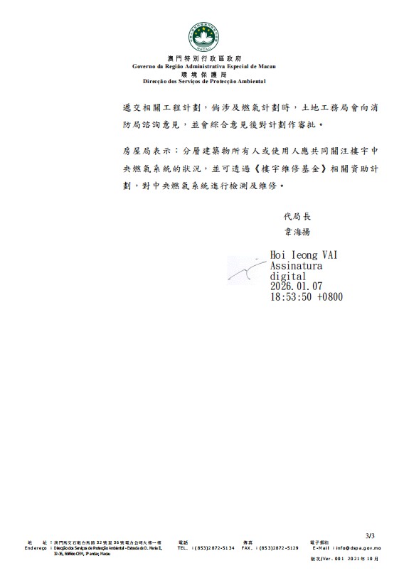 天然氣是當下城市重要的清潔能源,但是,由於天然氣具有腐蝕性等化學性質,令天然氣管道暴露出越來越多的危險因素,對城市以及市民的人身、財產安全造成潛在影響。本澳2002年以前,以罐裝石油氣供應為主,2002年,政府頒布第30/2002號《建築物中燃氣管路供氣設施的技術規章》等一系列行政法規,參照葡萄牙的做法,規範本澳燃氣系統的設計及建造。然而,有關行政法規欠缺如內地標準般對暗埋管道防腐蝕的技術要求以及對暗埋管道使用年限的要求。2021年,政府制定第27/2021號行政法規《建築物燃氣設施的技術規範》,增加了對暗埋管道防腐蝕的技術要求,並強化住戶內燃氣器具的安裝要求。第39/2022號行政法規《樓宇及場地防火安全技術規章》也增加了對燃氣系統的規定。