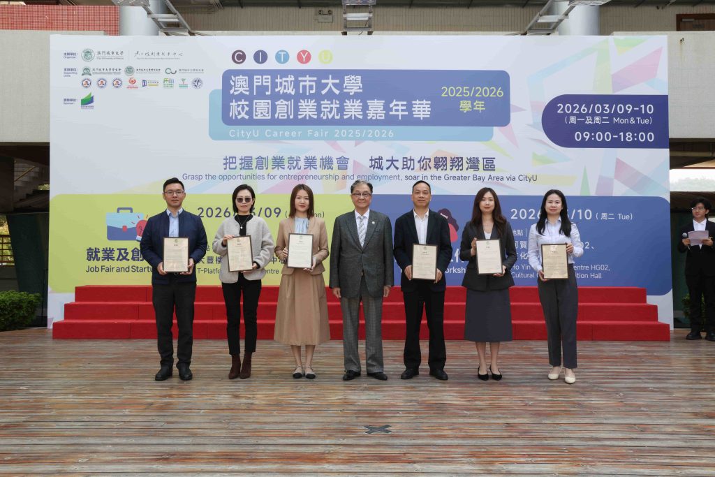 劉駿校長致辭時表示,城大始終致力於培育「懂澳門、懂灣區、懂世界」的應用型人才,為此成立吳在權創業就業中心,搭建「政、校、企」產學研協作平台,開設專題講座、技能培訓、創業競賽,推動課程國際認證,並組織學生走訪大灣區企業,深化校企合作,為學生爭取更多實習與就業機會。劉校長又勉勵學子,走出校園固然不易,求職或遇挫折,創業或有風險,但機會永遠留給有準備、有勇氣的人。