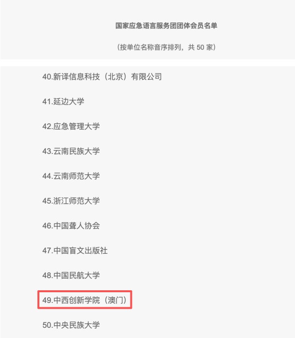 國家應急語言服務團理事會以通訊表決方式,正式批准中西創新學院等17家單位加入服務團。这是中西創新學院首次成為該國家級專業組織的成員單位,標誌著學校在語言服務、數字技術與公共安全交叉領域的專業能力獲得國家層面的高度認可,也為學校深度參與國家應急體系建設、服務「平安中國」與「數字中文」戰略提供了重要平台。
