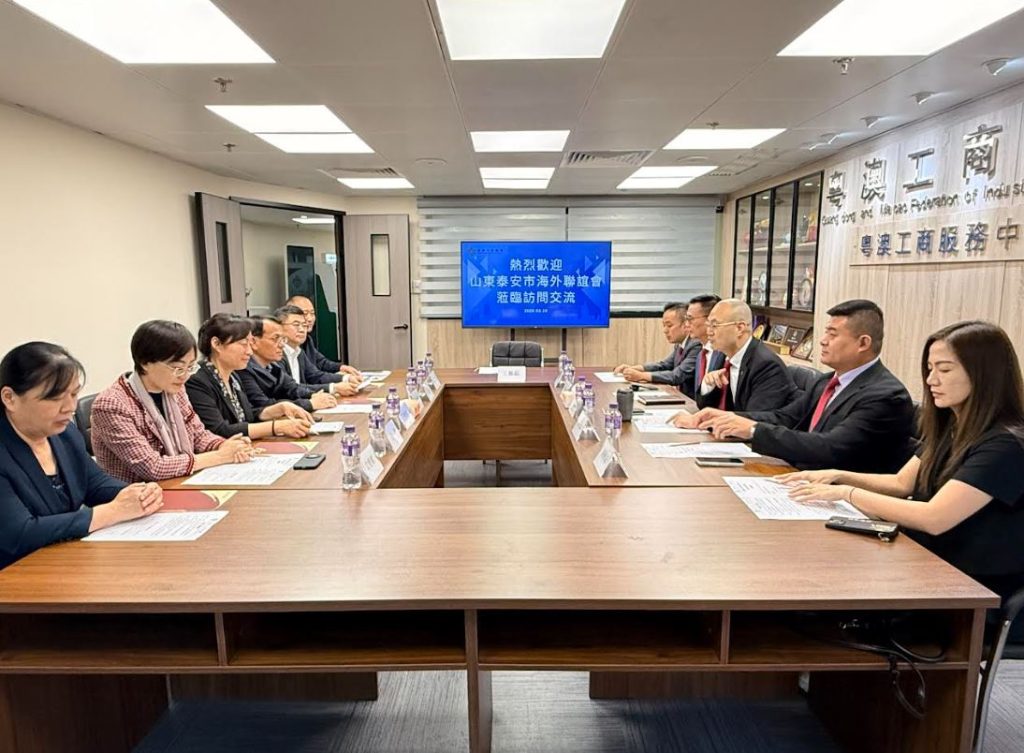 【環球新聞報訊】3月19日,山東泰安市委統戰部副部長、泰安市海外聯誼會副會長王琳琳,市教育局黨組成員、副局長王家民,新泰市委常委、統戰部部長,新泰市政協黨組副書記、新泰市海外聯誼會會長王翠一行到訪粵澳工商聯會,獲商會會長施家倫,理事長黃仁民、副會長兼粵澳工商服務中心主任曾增偉、青年委員會主任陳彬涼、區域合作部部長鍾添漂等熱情接待。雙方圍繞兩地產業對接、資源互補、合作共贏等議題深入探討,凝聚發展共識。
