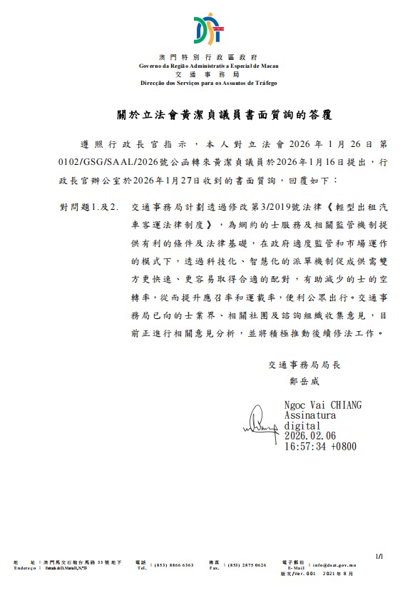 澳區政府交通事務局關於立法會黃潔貞議員書面質詢的答覆如下: