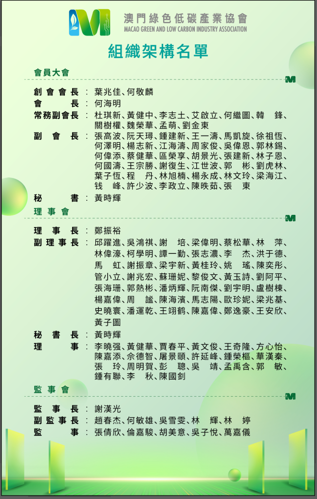 何海明強調,綠色低碳不僅是責任,更是澳門經濟適度多元發展的新引擎。未來三年,新一屆理監事將以「三個堅持」深化使命:堅持平台賦能,深化「產學研用」協同,推動綠色技術從實驗室走向市場;堅持創新驅動,探索「綠色+金融」「綠色+文旅」等跨界融合模式,打造澳門特色低碳產業鏈;以及堅持開放合作,主動融入粵港澳大灣區綠色生態圈,聯動橫琴、香港及國際資源,讓澳門成為綠色技術「引進來、走出去」的重要樞紐。