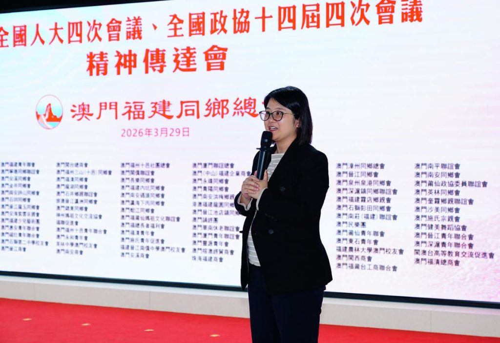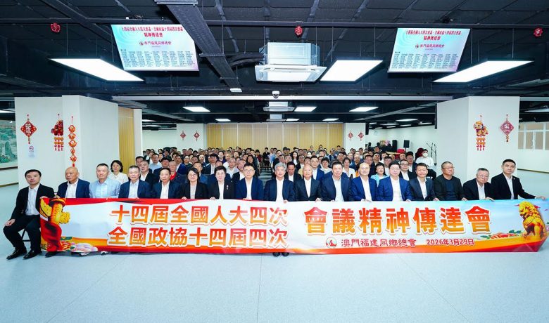 【環球新聞報訊】3月29日下午,澳門福建同鄉總會組織116個團體會員於會址內聯合舉辦2026全國兩會精神傳達會。福建省政協副主席阮詩瑋,福建省委統戰部常務副部長黃進發,澳門中聯辦協調部副部長劉冠宇,福建省政協港澳台僑和外事委員會副主任林金章,福建省海外聯誼中心主任、一級調研員陳燕影,澳門中聯辦協調部副處長辜智欽等應邀出席。全國人大代表陳虹、施家倫,全國政協委員陳明金、吳士芳傳達兩會精神。澳門福建同鄉總會執行會長宋碧琪主持會議、各團體代表及總會理監事成員共250人參會。