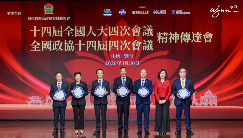 【環球新聞報訊】為深入學習貫徹2026年全國兩會精神,把握國家「十五五」規劃機遇、助力澳門更好融入國家發展大局。3月30日下午,福建省澳區政協委員聯誼會主辦,聯同永利澳門、澳門中華文化發展促進會、海峽兩岸青年文化交流中心、澳門台商聯誼會、澳門國際銀行、澳門新大陸萬博科技有限公司、中福技術服務(澳門)有限公司,大力支持的「十四屆全國人大四次會議、全國政協十四屆四次會議精神傳達會」,於永利皇宮宴會廳隆重舉行,現場約五百名各界人士參與,活動氛圍熱烈莊重。