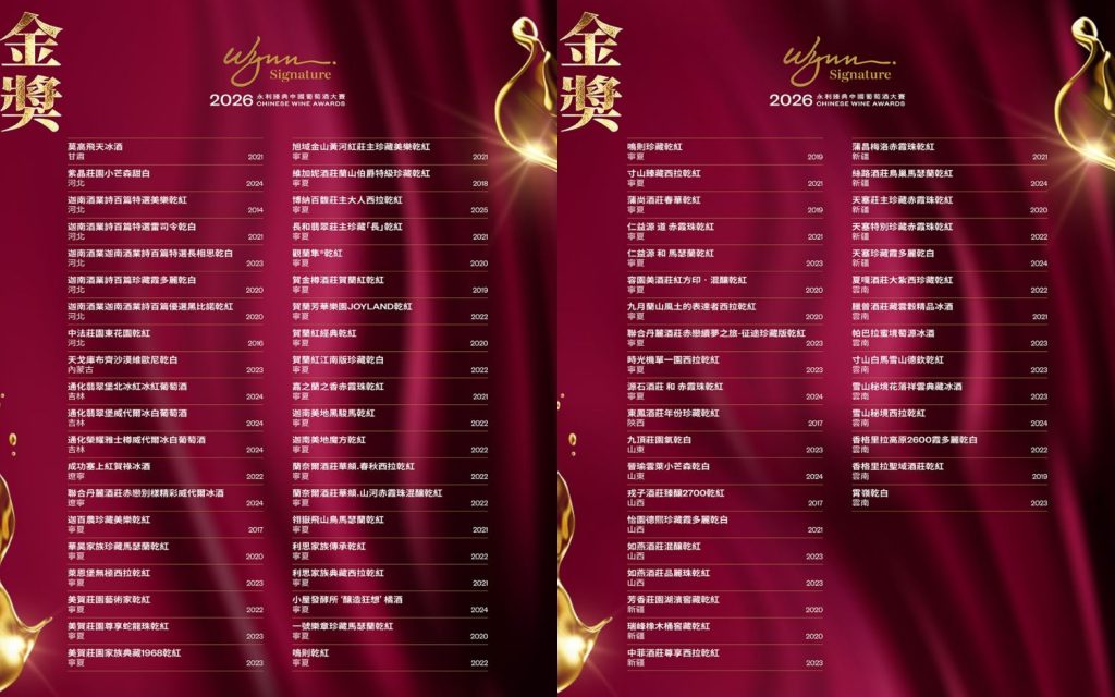 「2026 永利臻典——中國葡萄酒大賽」揭曉金獎佳釀名單: