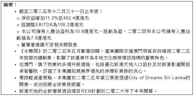 【環球新聞報訊】新濠國際發展有限公司(「新濠國際」或「本公司」,連同附屬公司統稱「本集團」)(聯交所股份代號:200)今天公布截至二零二五年十二月三十一日止年度的全年業績。