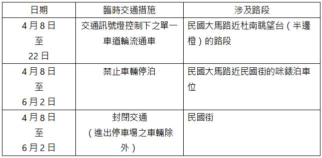 民國大馬路水管鋪設工程 作者: admin 发布: 2026年4月2日 6阅读 【環球新聞報訊】澳門自來水將於4月8日(周三)至6月2日(周二)在民國大馬路一帶進行水管鋪設工程。獲市政署核准並經交通事務局協調,澳電將一併進行電纜鋪設工程,以縮短工期。屆時民國大馬路及民國街將實施臨時交通安排(詳情可查閱附表)。敬請市民及駕駛者出行前留意。如有查詢,請致電客戶熱線:2822 0088。