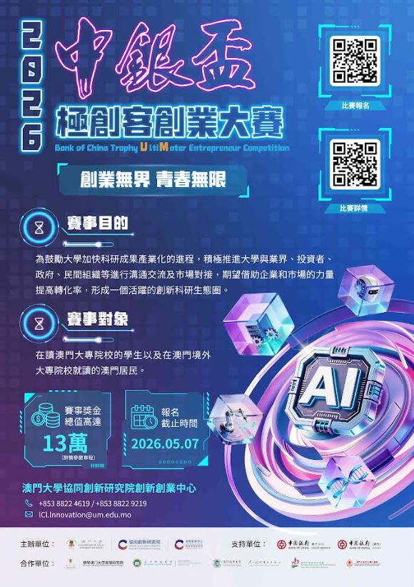 有興趣的合資格人士可由即日起至2026年5月7日登入:https://umac.questionpro.com.au/t/ARuH2ZSBNf報名,詳情可瀏覽:https://cie.ici.um.edu.mo/zh/event-zh/2026-ultimater-cp/。如有查詢,請與澳大創新創業中心聯絡(電話:+853 8822 4619 或 8822 9429;電郵:ICI.Innovation@um.edu.mo)。