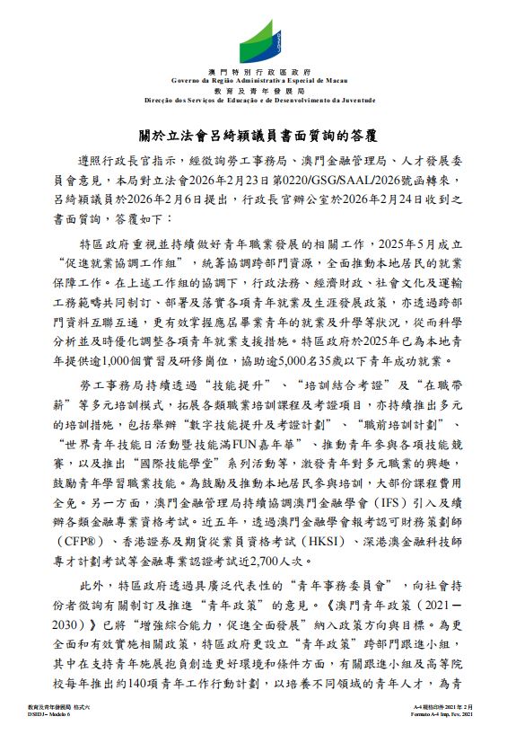 澳區政府教育及青年發展局關於立法會呂綺穎議員書面質詢的答覆如下: