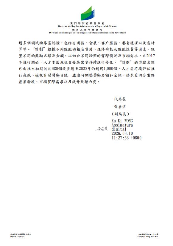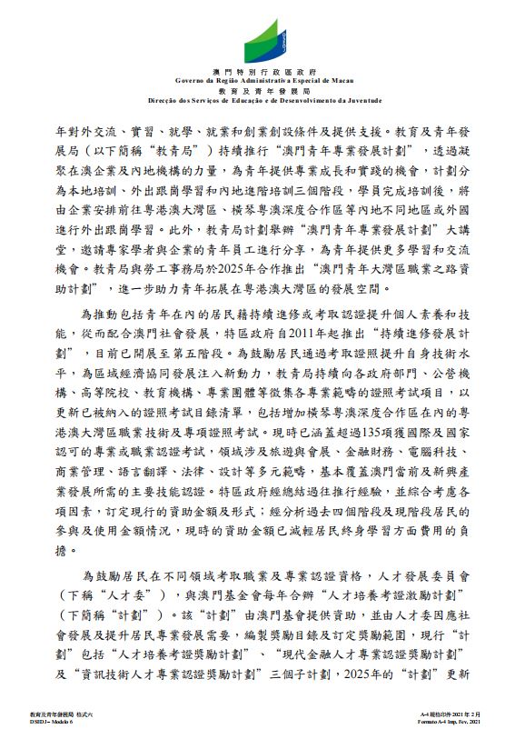 2、請問當局會否研究在現時持續進修計劃的基礎上,額外設立青年專業考證課程補貼,為報讀符合澳門新興產業發展所需課程,並達到一定成績要求的青年提供進一步進修補貼,以更大力度提供澳門青年專業競爭力,為全面對接國家十五五規劃,以及落實澳門三五計劃做好準備?