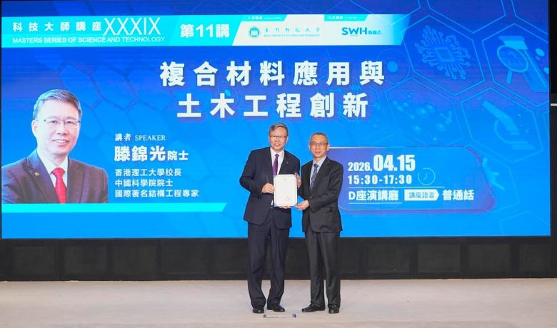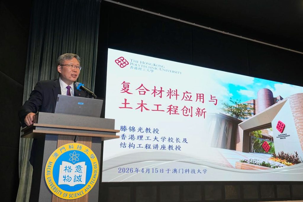 【環球新聞報訊】由澳門科技大學主辦的科技大師講座「複合材料應用與土木工程創新」,於2026 年 4 月 15 日(星期三)下午在 D座演講廳成功舉辦。本講座邀請到香港理工大學校長、中國科學院院士、國際著名結構工程專家滕錦光院士主講。澳科大副校長姜志宏致辭及向滕院士頒發榮譽聘書並致送紀念品。