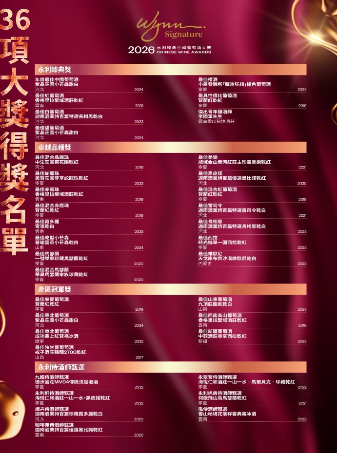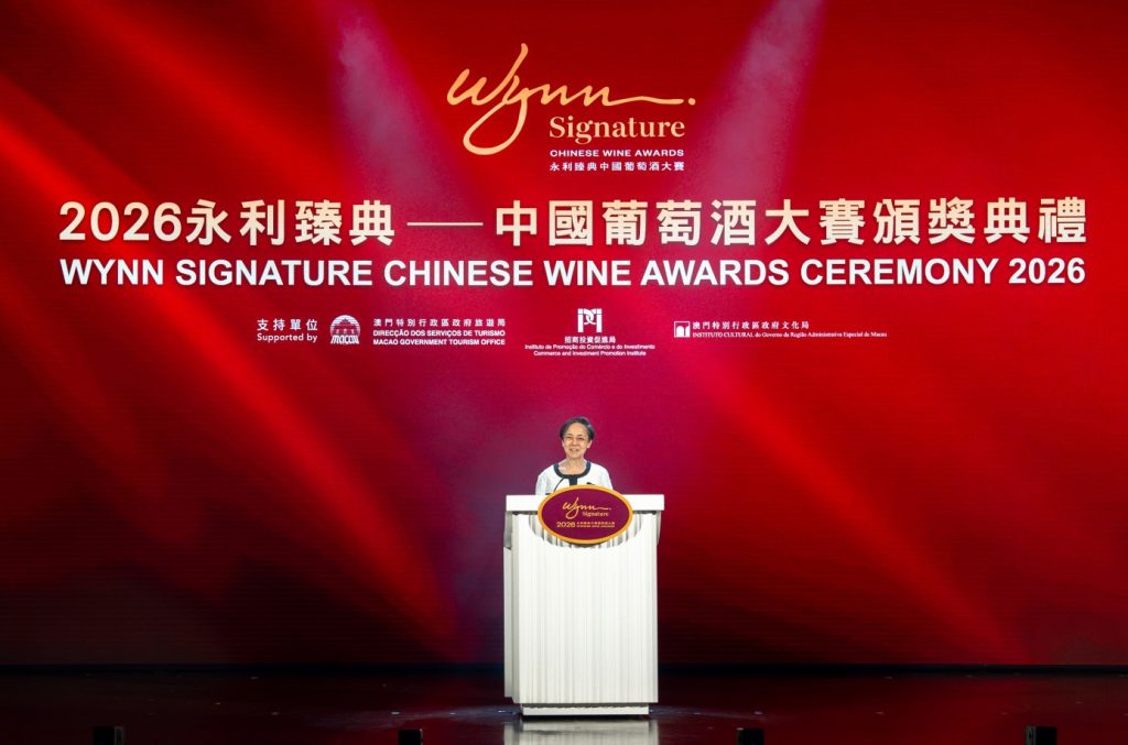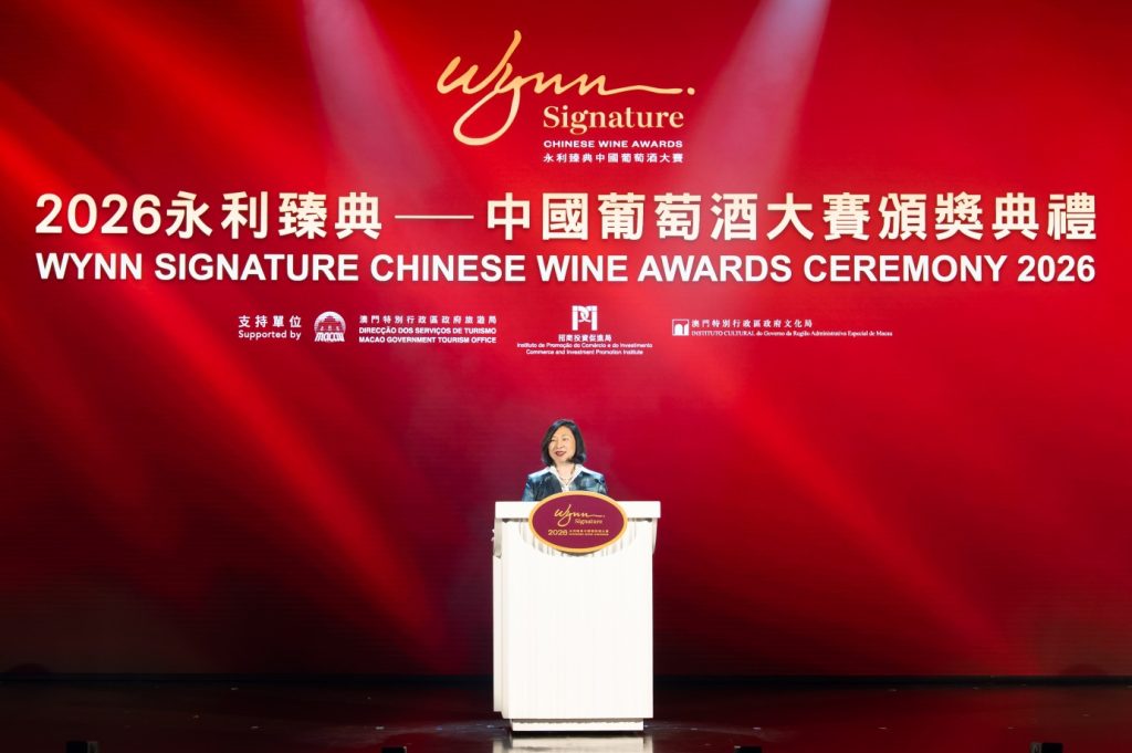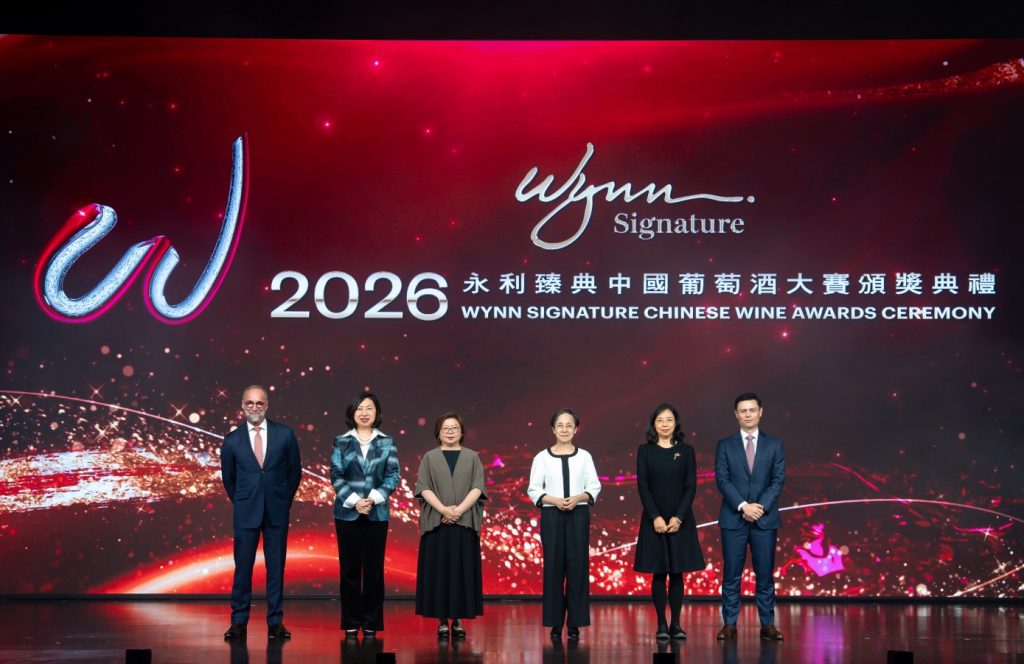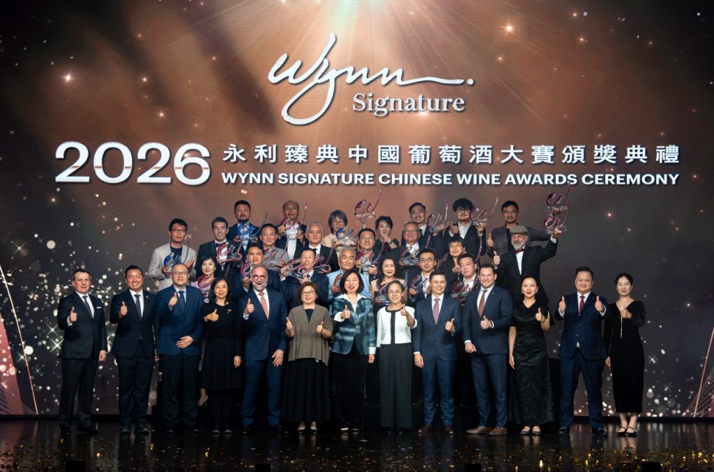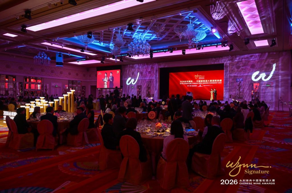 【環球新聞報訊】由永利渡假村旗下精緻體驗品牌「Wynn Signature 永利臻典」全力打造的「2026 永利臻典——中國葡萄酒大賽」頒獎典禮,在澳門特別行政區政府旅遊局、澳門特別行政區政府招商投資促進局,及澳門特別行政區政府文化局的支持下,於 4 月 24 日晚在永利皇宮盛大舉行。逾二百位葡萄酒專家、中國酒莊代表、業界人士、國際媒體和葡萄酒愛好者齊聚澳門,共同見證 36 項年度最佳獎項的揭曉和加冕。本屆大賽由「紫晶莊園小芒森甜白 2024」脫穎而出,奪得本年度「年度最佳中國葡萄酒」最高榮譽。