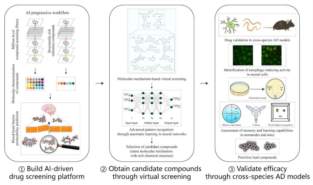 中藥與天然產物歷來是藥物創新的重要源泉,然而其化學成分結構複雜、數目龐大,傳統篩選方法耗時費力,難以適應中藥現代化的發展需求。為突破這一技術瓶頸,研究團隊開發了人工智能驅動的新型中藥活性成分發現平台。該平台深度融合團隊前期研究基礎與前沿人工智能技術,借助先進算法與計算模型,可高效鎖定兼具神經保護、自噬調控活性及良好跨血腦屏障潛力的中藥活性成分。歷經兩次關鍵迭代(第一代成果已於2022年發表於《自然-生物醫學工程》),平台的天然產物及中藥化合物庫規模已擴充至百萬級別,篩選速度與準確度亦獲得顯著提升。目前,多個候選化合物已在疾病動物模型中展現優異效果,正處於進一步開發階段。