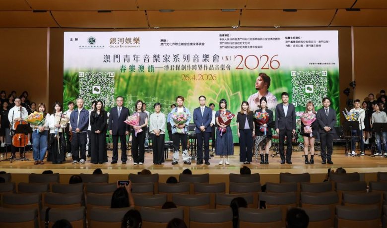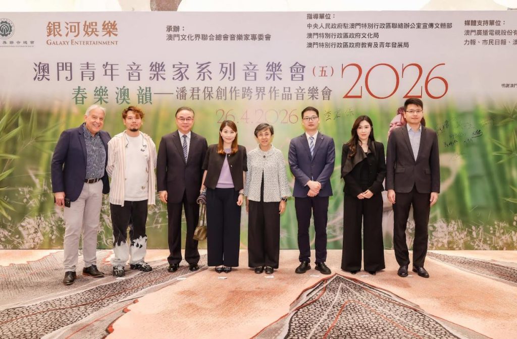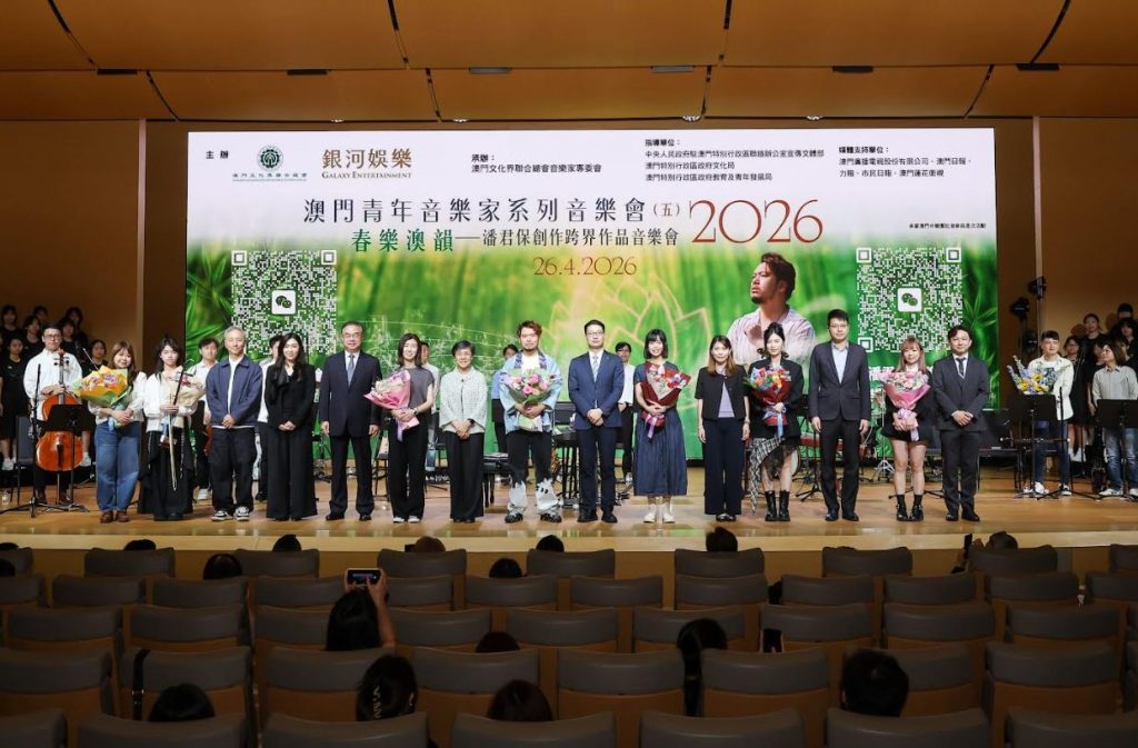 【環球新聞報訊】4月26日晚,銀河國際會議中心之銀河演講廳燈火璀璨、掌聲不息,由銀河娛樂集團(「銀娛」)與澳門文化界聯合總會聯合主辦、澳門文化界聯合總會音樂家專委會承辦之澳門青年音樂家系列音樂會2026年首場演出圓滿落幕。這場以《春樂澳韻——潘君保創作跨界作品音樂會》為名的音樂盛宴,緊扣「中西古今,澳門創作」的核心主題。多元交織的旋律中,澳門青年音樂人筆下的家國情懷與城市底蘊,在音符間自然流淌。